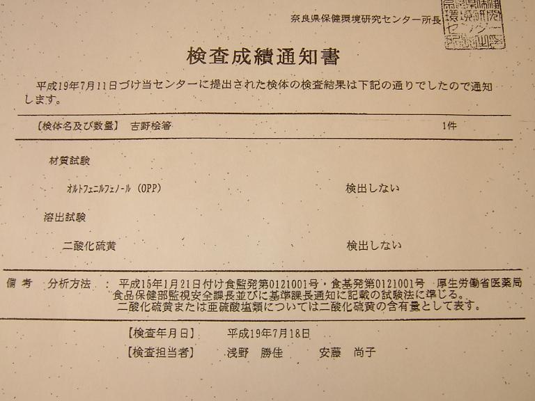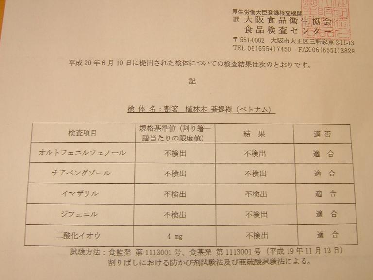 弊社で使用する割り箸につきましては、防腐剤・漂白剤などは使用せず、厚生労働省の品質管理基準をクリアした安心・安全なものを使用しております。